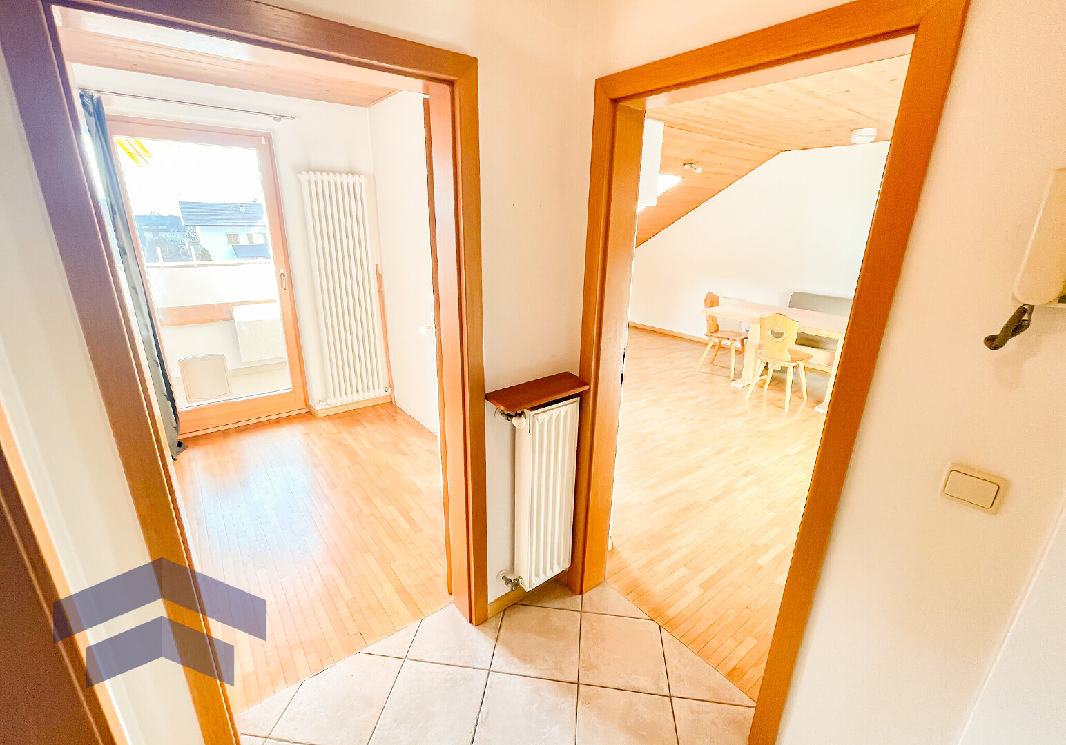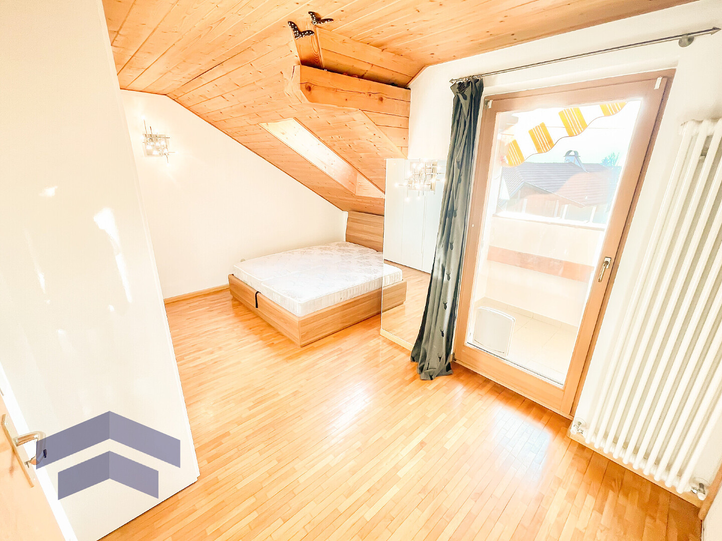 Schlafzimmer gelangt man auf den sonnigen Balkon, der zum